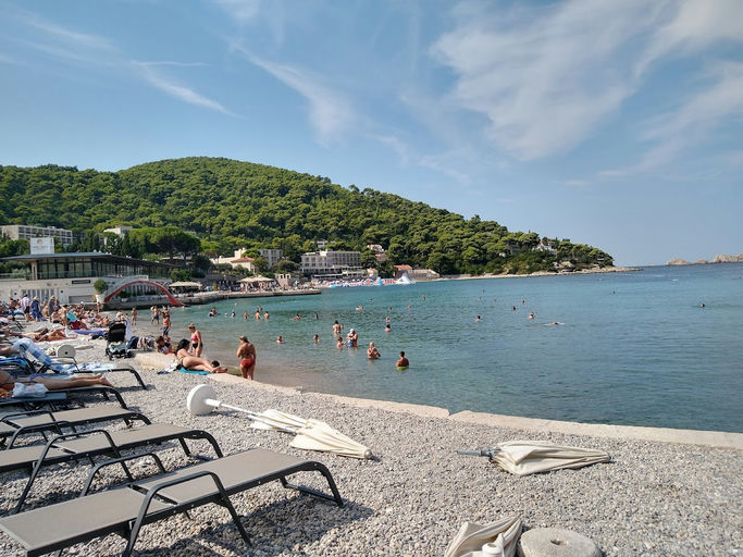 This beach is a long stretch of pebbles and sand, surrounded by a walking path and lined with palm trees. The water is super clear and calm, making it easy to swim or just chill by the shore. There are cafes and ice cream spots nearby, so you can grab a snack without leaving the area.