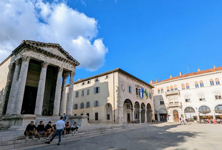 This spot is the main square in the city and has been around since Roman times. It’s surrounded by old buildings, including a super well-preserved Roman temple. People have been hanging out here for over 2,000 years, so it’s basically a living piece of history.
